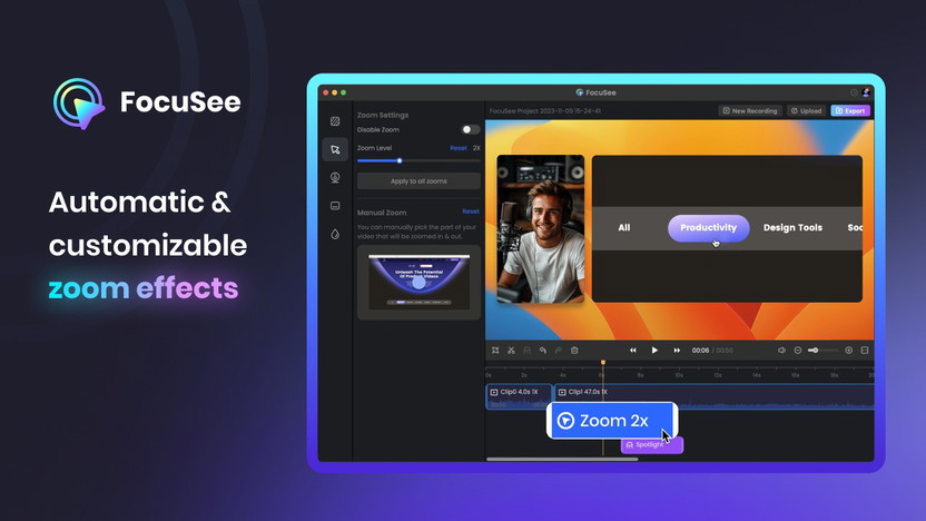 - التحرير التلقائي: هذه الميزة هي السبب الرئيسي الذي جعلني أفضل FocuSee على أي برنامج آخر. البرنامج يتبع حركة المؤشر ويضيف تأثيرات تكبير ديناميكية تلقائيًا، مما يوجه انتباه المشاهد إلى النقاط المهمة. كما يولد تعليقات توضيحية تلقائية يمكنني تعديلها بسهولة إذا لزم الأمر.