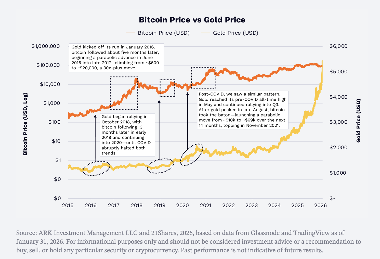 في هذا المقال، سنغوص في تحليل شارت خطير من مؤسسة ARK Invest، يكشف العلاقة "السرية" بين تحركات الذهب وانفجارات البيتكوين السعرية، ولماذا قد نكون الآن أمام فرصة العمر.